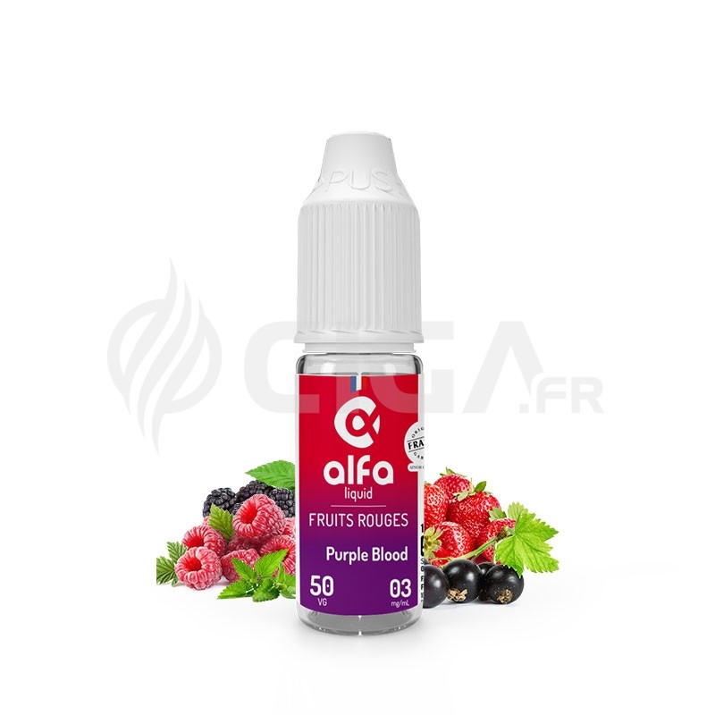 Le eliquide Purple Blood de Alfaliquid est fabriqué en France au taux 50% PG / 50% VG.